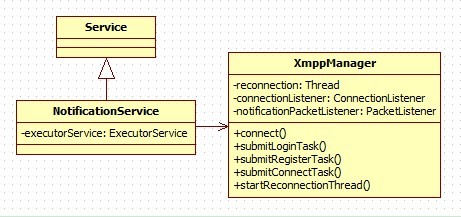 从类的层次看这个结构比较简单,让其变得复杂的是,其里面有三个线程:主线程,进行Xmpp通信线程,连接出错重试线程。