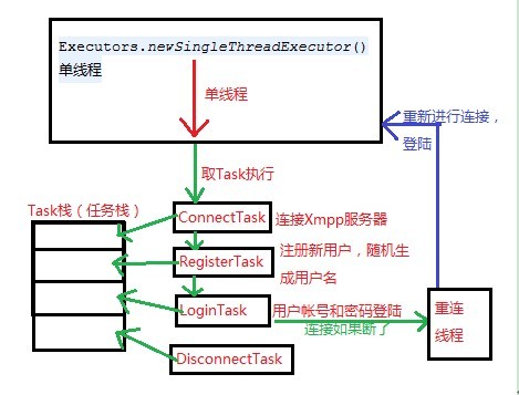 对图说明: 1. 在NotificationService里创建一个单线程,让其对服务器进行连接,由于使用Xmpp连接服务器要分为三步:连接,注册,登陆。所以用一个栈来保存要执行的Task任务(ConnectTask,RegisterTask,LoginTask),还后再按这个顺序进行执行。 2. 连接Xmpp服务器的线程用的是Executors.newSingleThreadExecutor(),这个本身可以不停的submit任务。为什么还要自己用一个栈来保存Task了 3. 连接线程在连接,注册,登陆的过程中,都有可能出错,都可能会失败,这时我就要有一个重连的机制,在Androidpn里开了另外一个线程来进行重试,其重试不是每次都按多少秒来进行重试,而是有其自己的规则。 4. 在LoginTask里,如果登陆了服务器端,其就会注册一个监听器,用于监听服务器push的数据包(Packet),再通过发送广播的方式来通知要进行显示的程序。 5. 在登陆服务器后,也有可能出错,所以在登陆后,会设置一个ConnectionListener,用于监听连接出错的时候,再合适重连线程,进行重连 6. 在登陆过程中,有一种错误要单独处理,就是账号和密码无效的时候,这个时候其返回的状态码是401,这种情况应该把本地保存的帐号和密码都清掉,再重新进行连接,不然会永远都登陆不上服务器端。 由于该系统所有的功能实现都是基于网络间的XML流的通信,所以,需要有一个模块专门负责网络问通信和XML流的处理,主要功能包括服务器和客户端之问通信时TCP套接字的处理,XML流的解析、存储等功能。